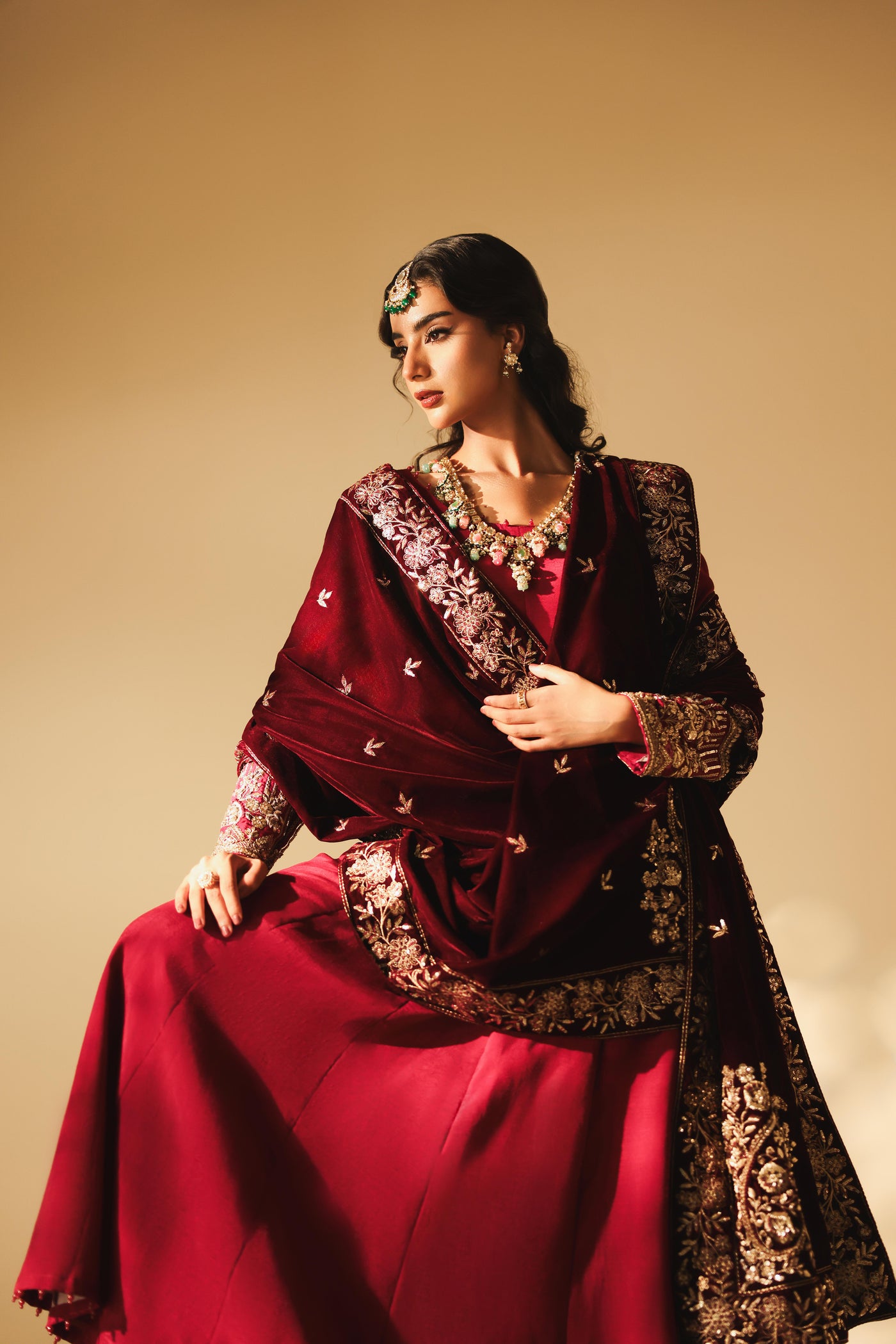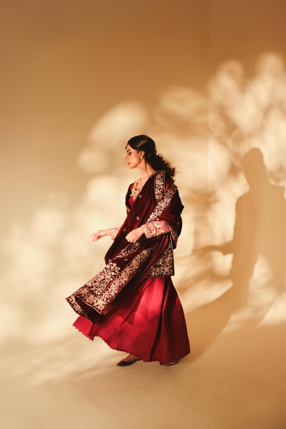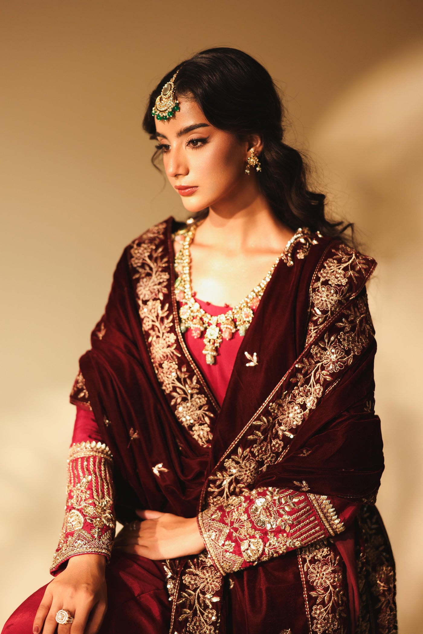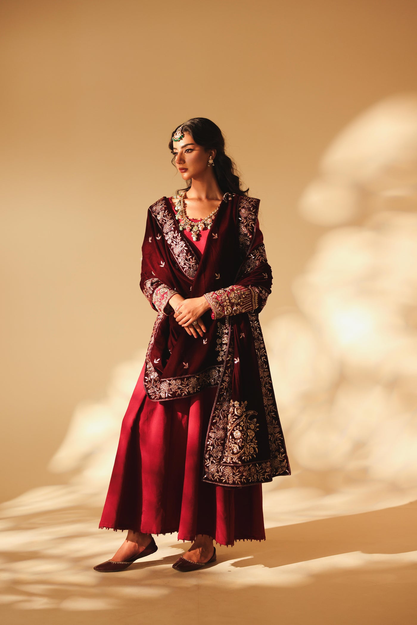 A masterpiece of timeless grandeur, Garnet is designed to embody refined opulence. This deep magenta, raw silk pishwas features a classic boat neckline and exquisitely hand-embellished sleeves, meticulously adorned with intricate embroidery and delicate embellishments — a testament to exceptional craftsmanship. Stone detailing along the neckline and hem adds a subtle yet striking touch of brilliance, enhancing the richness of the silhouette. The look is elevated with a maroon velvet shawl, lavishly embroidered and handworked with sequin detailing, lending a sense of regal heritage. Paired with sleek raw silk trousers, this ensemble exudes royal elegance — making it a statement for wedding festivities and grand occasions.