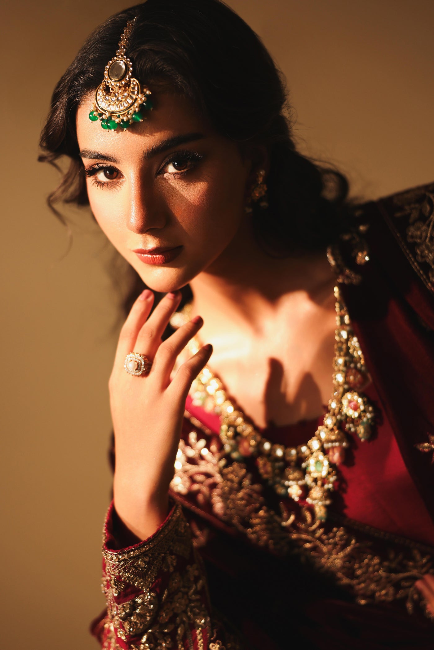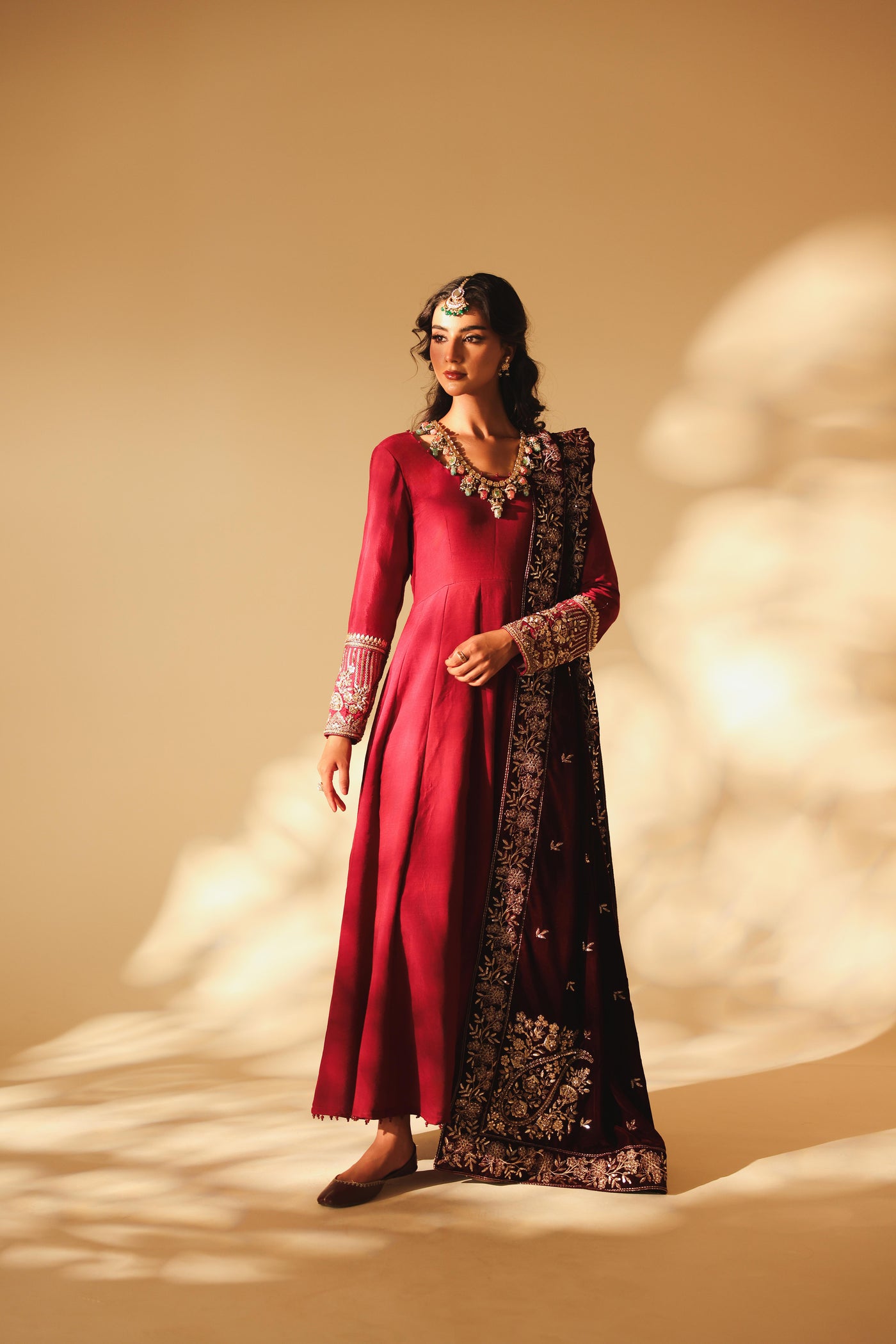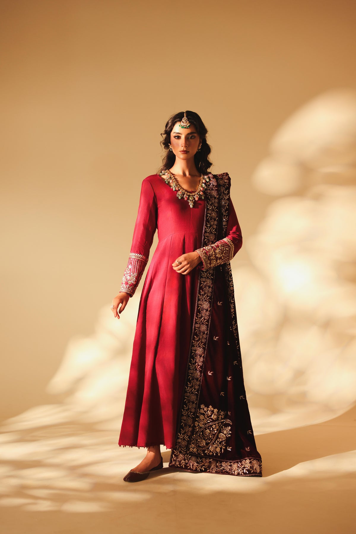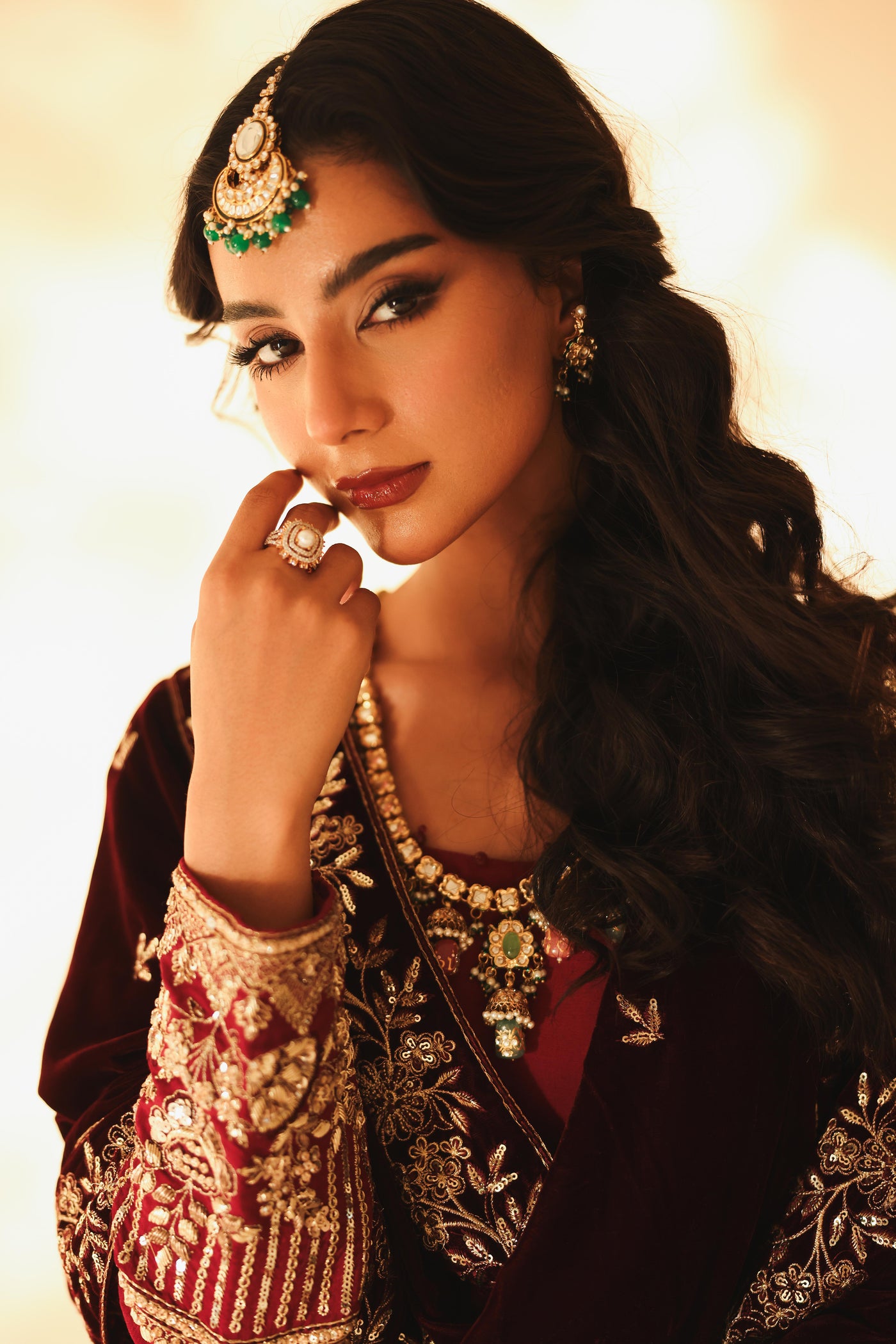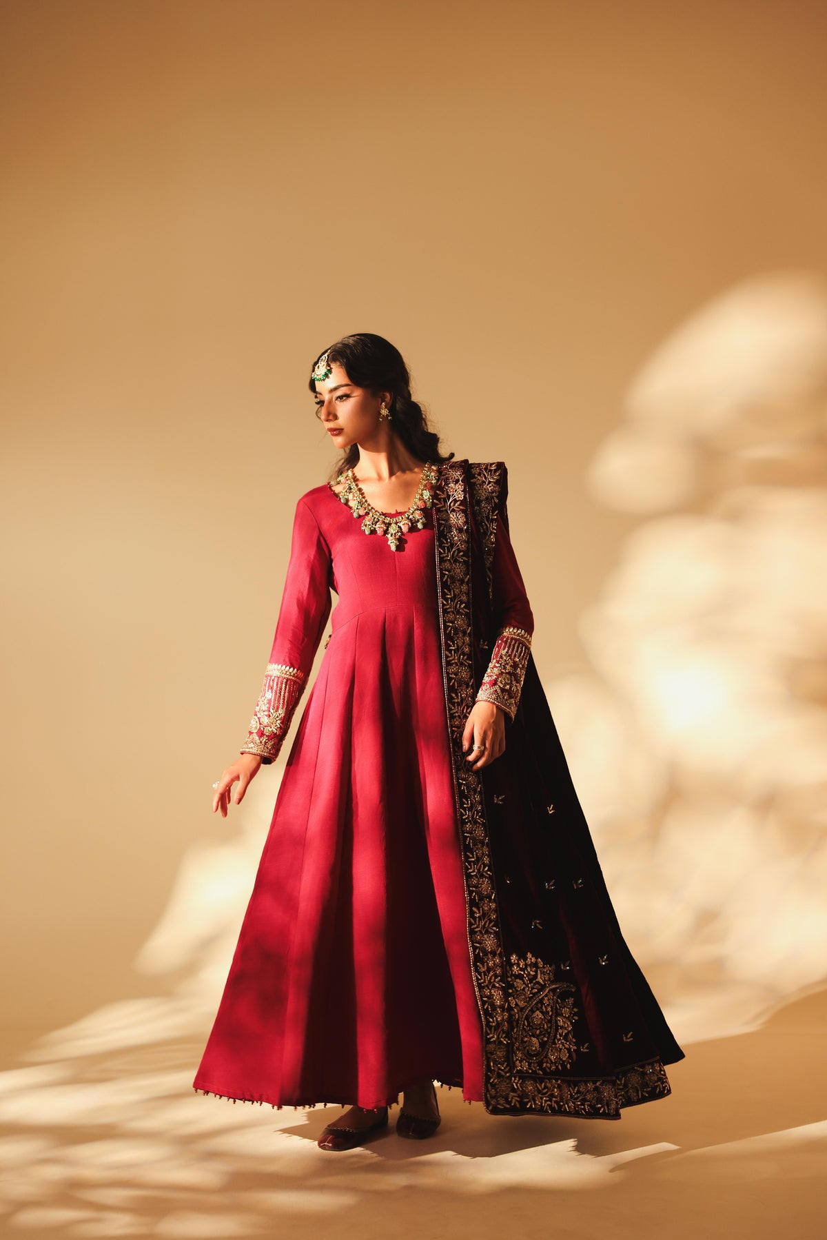 A masterpiece of timeless grandeur, Garnet is designed to embody refined opulence. This deep magenta, raw silk pishwas features a classic boat neckline and exquisitely hand-embellished sleeves, meticulously adorned with intricate embroidery and delicate embellishments — a testament to exceptional craftsmanship. Stone detailing along the neckline and hem adds a subtle yet striking touch of brilliance, enhancing the richness of the silhouette. The look is elevated with a maroon velvet shawl, lavishly embroidered and handworked with sequin detailing, lending a sense of regal heritage. Paired with sleek raw silk trousers, this ensemble exudes royal elegance — making it a statement for wedding festivities and grand occasions.