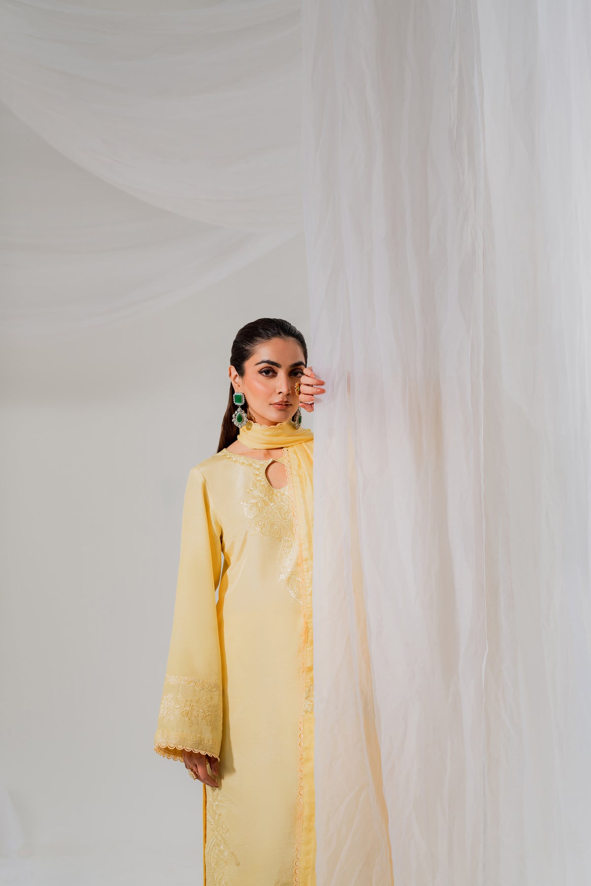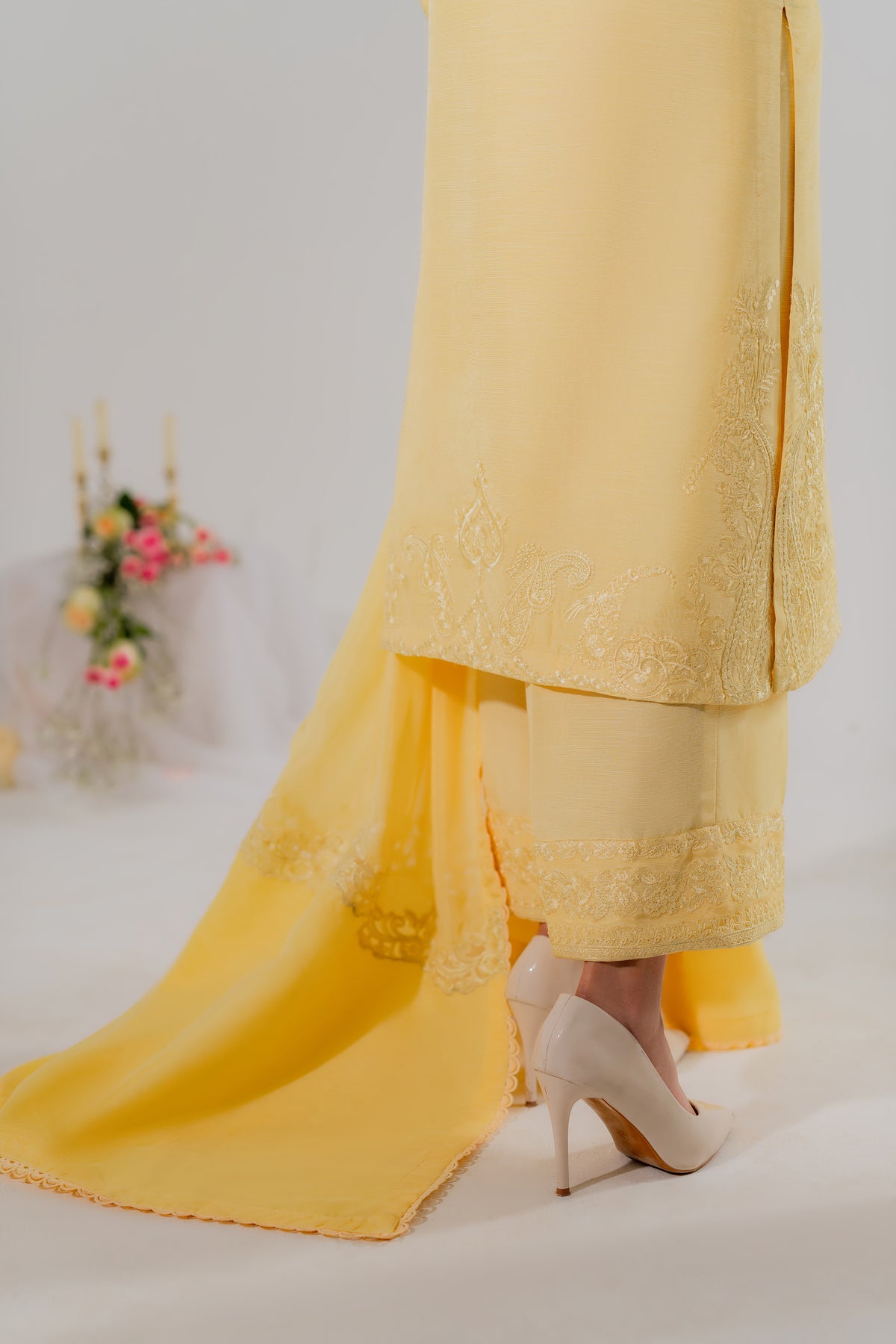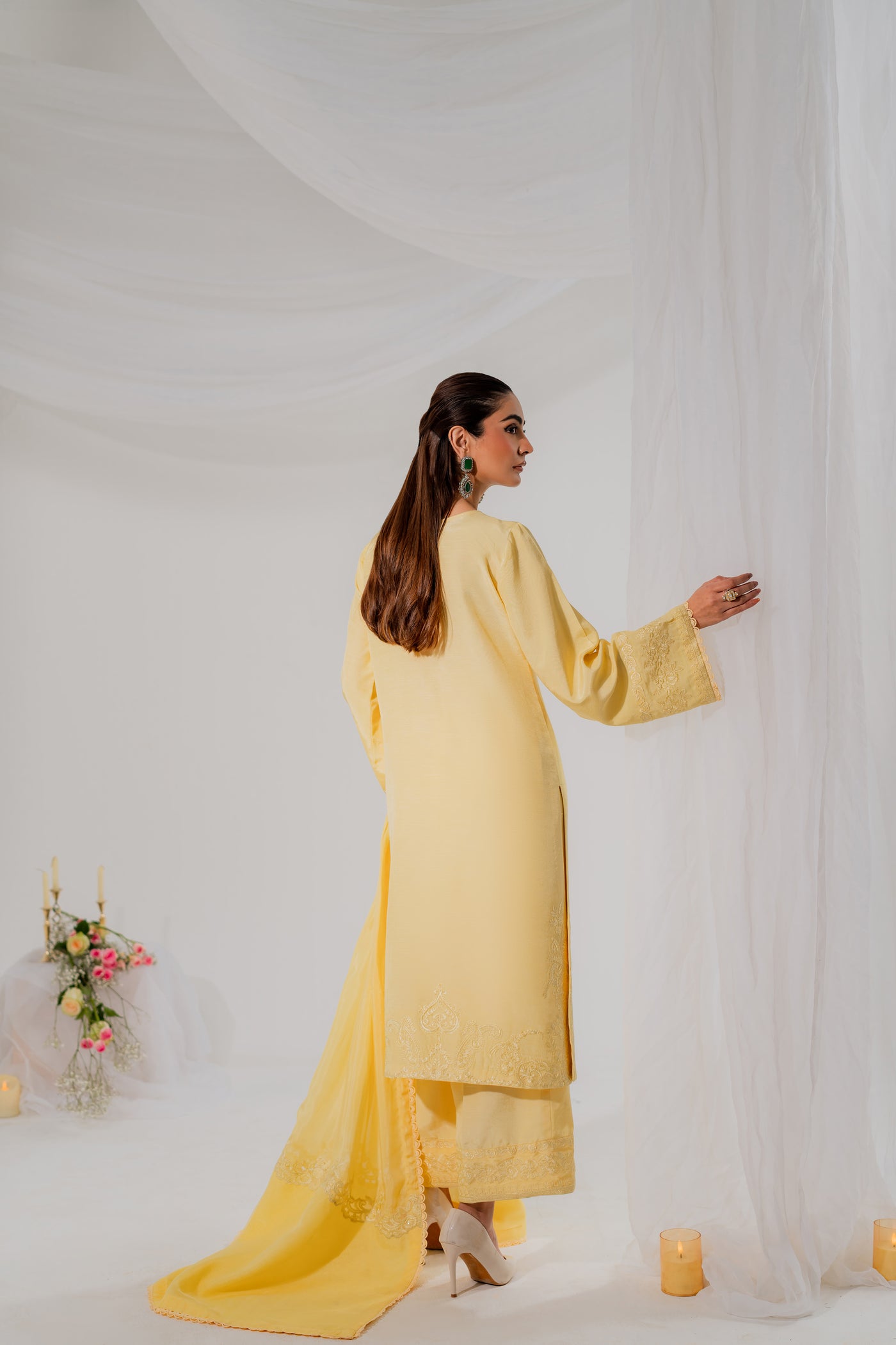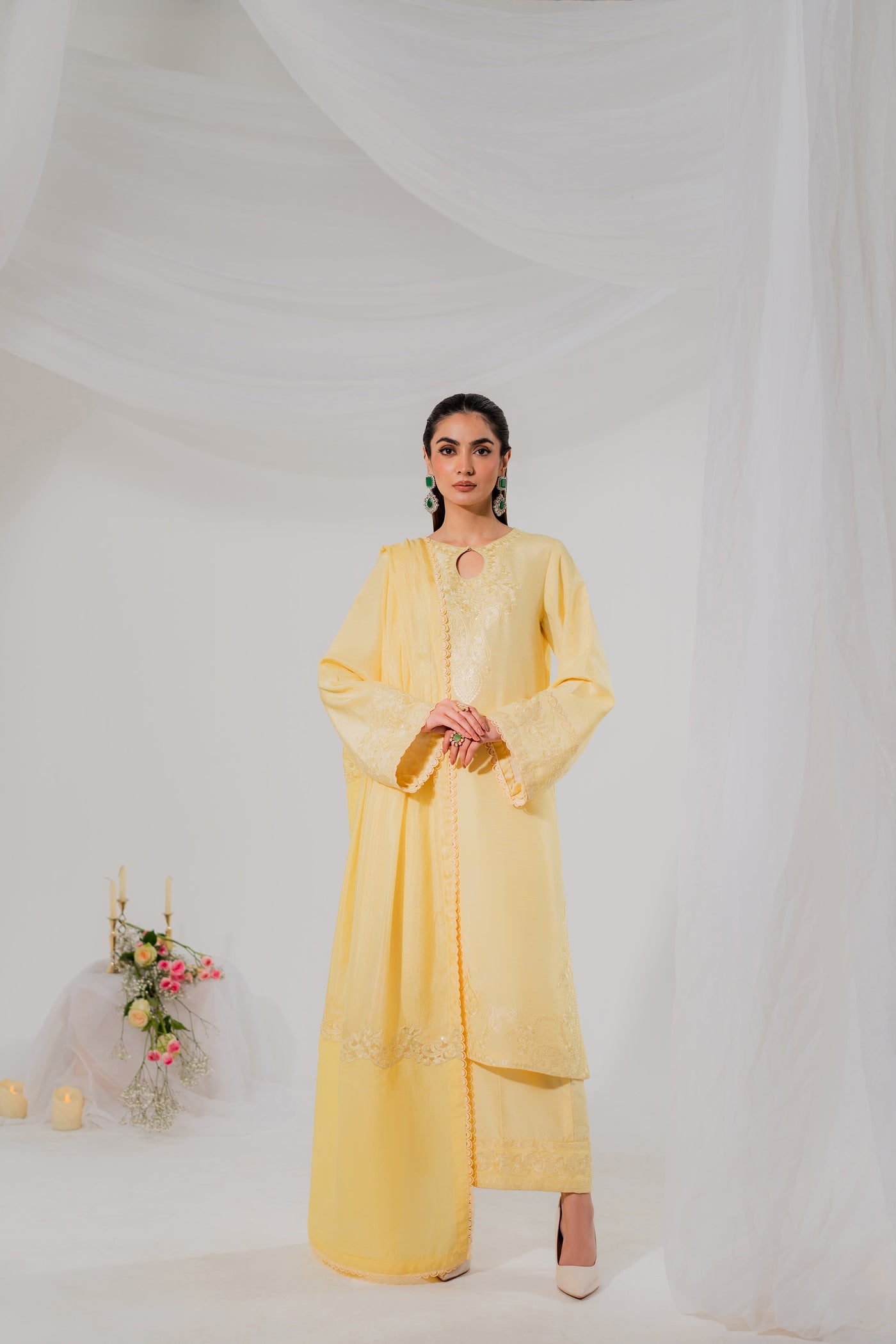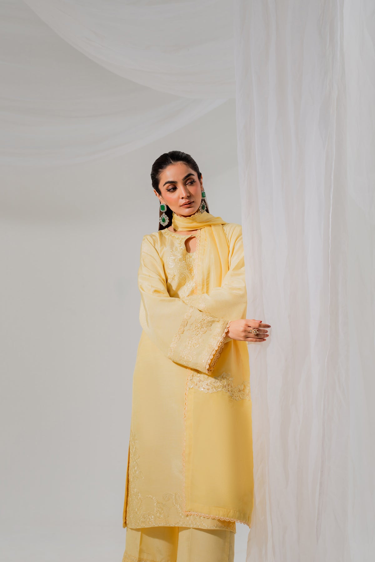 Halo is a butter-yellow monochromatic dream. Crafted in pure silk, the shirt glows with delicate sequin embroidery that catches the light effortlessly. The straight silk trousers maintain a sleek silhouette, while the standout dupatta featuring a structured organza patch adds a bold, modern layer of texture. This is high-fashion made wearable, ideal for sunlit festivities or evening glam with edge.