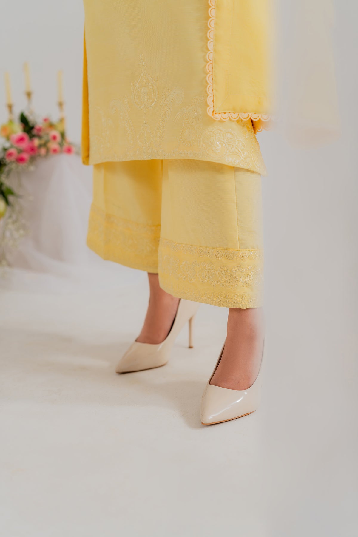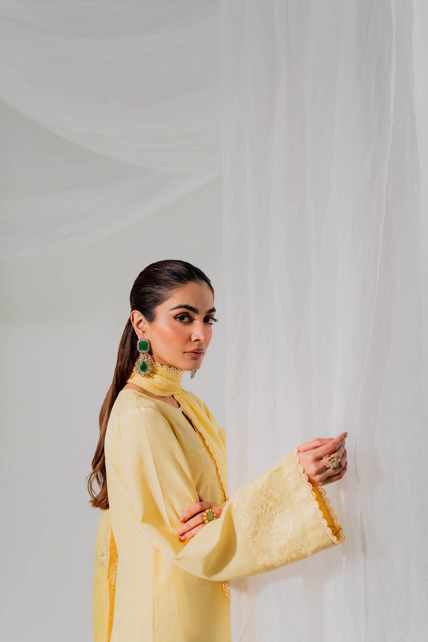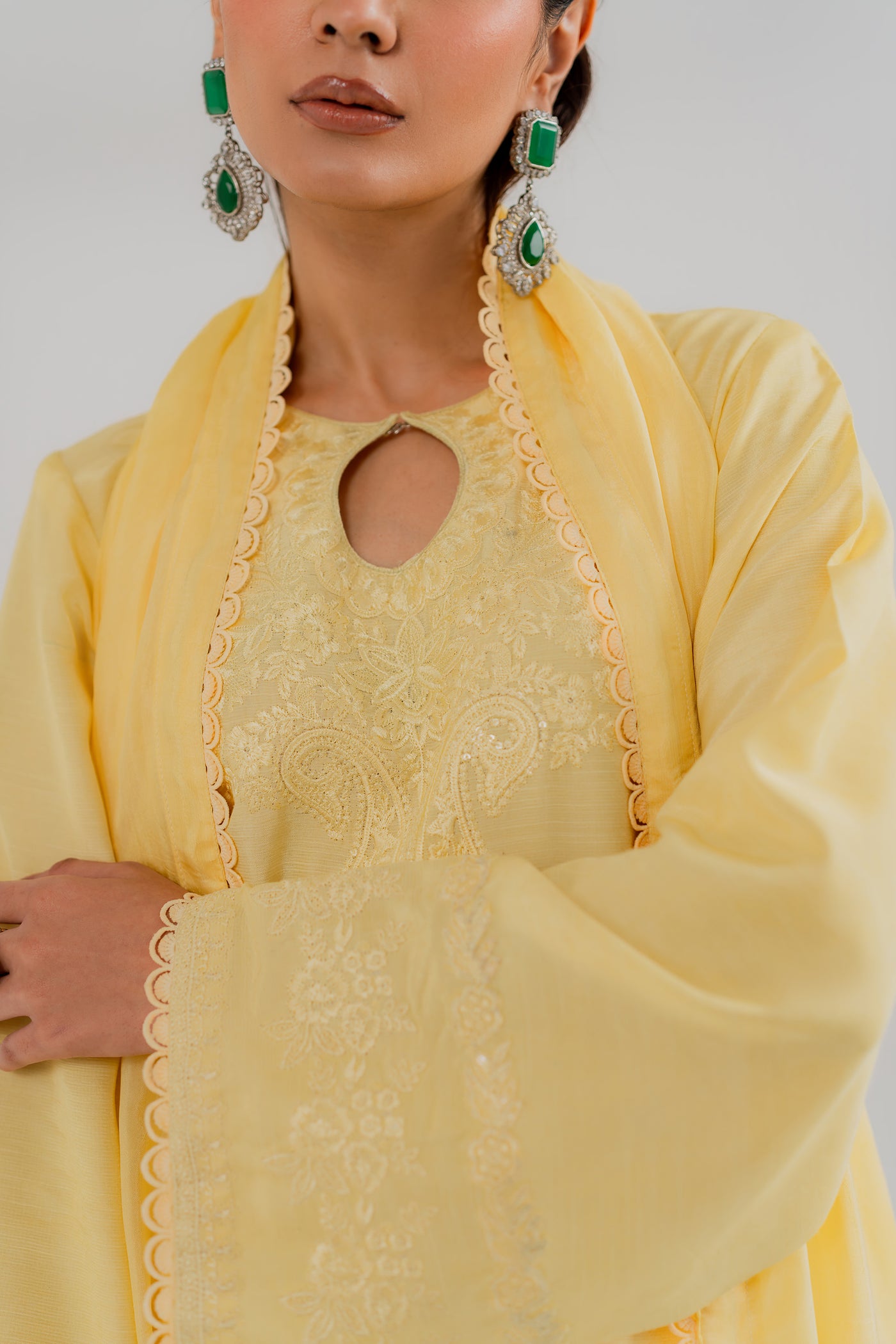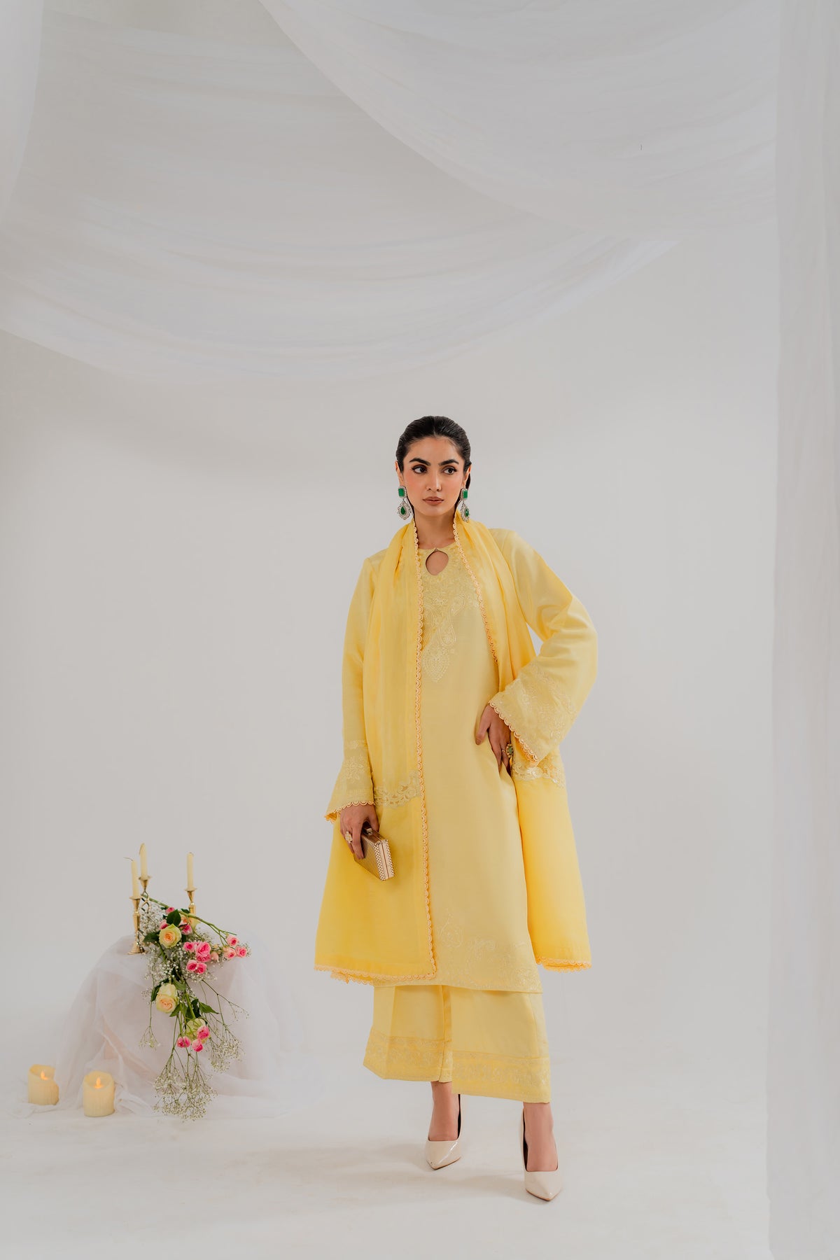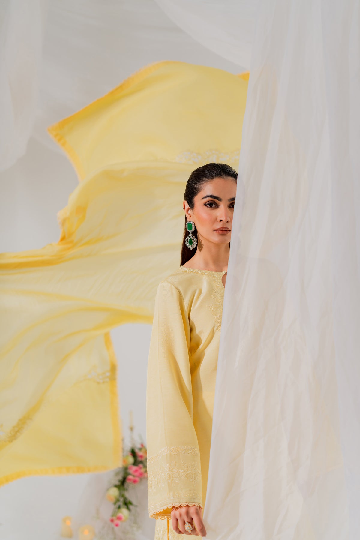 Halo is a butter-yellow monochromatic dream. Crafted in pure silk, the shirt glows with delicate sequin embroidery that catches the light effortlessly. The straight silk trousers maintain a sleek silhouette, while the standout dupatta featuring a structured organza patch adds a bold, modern layer of texture. This is high-fashion made wearable, ideal for sunlit festivities or evening glam with edge.