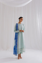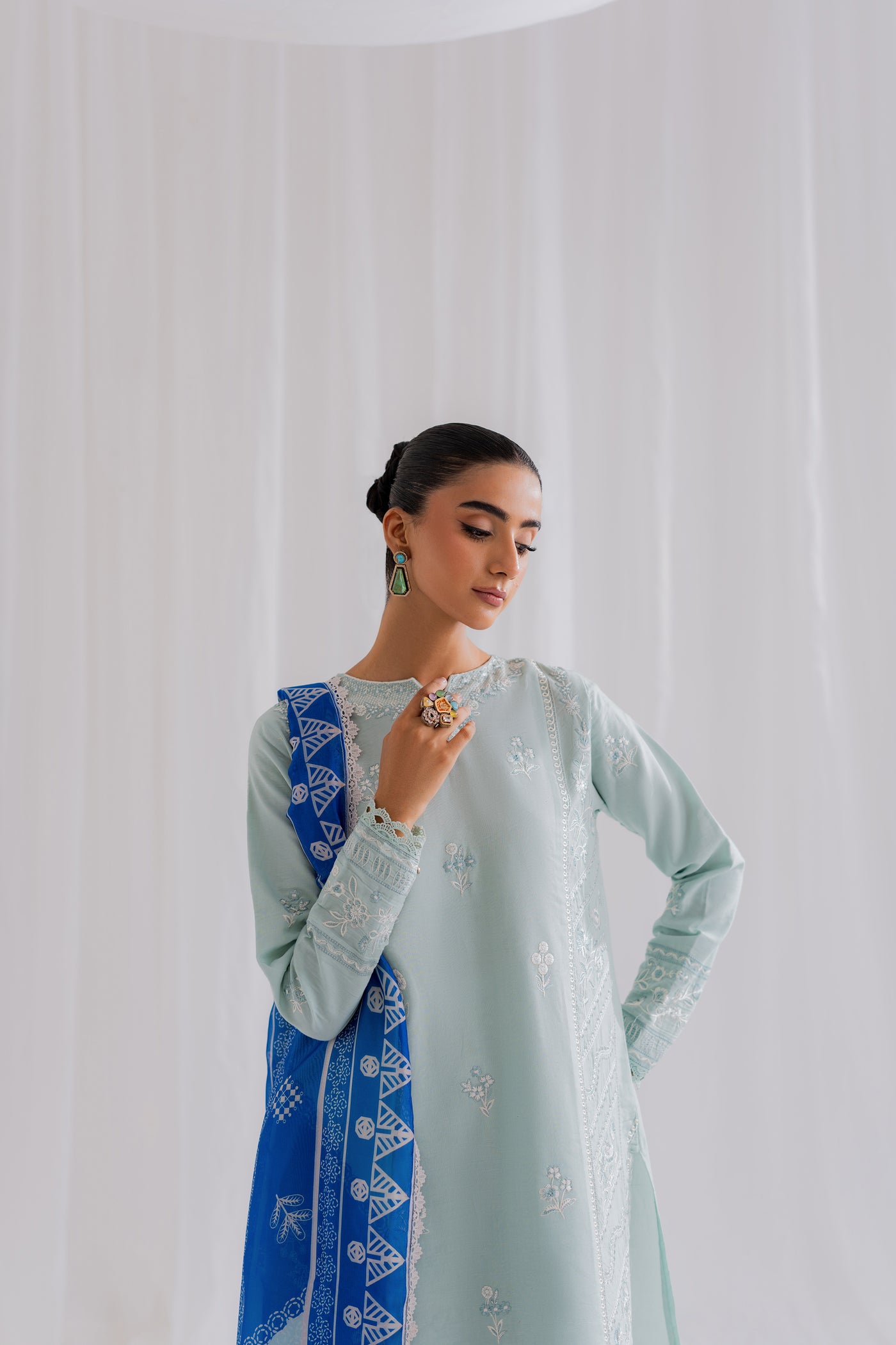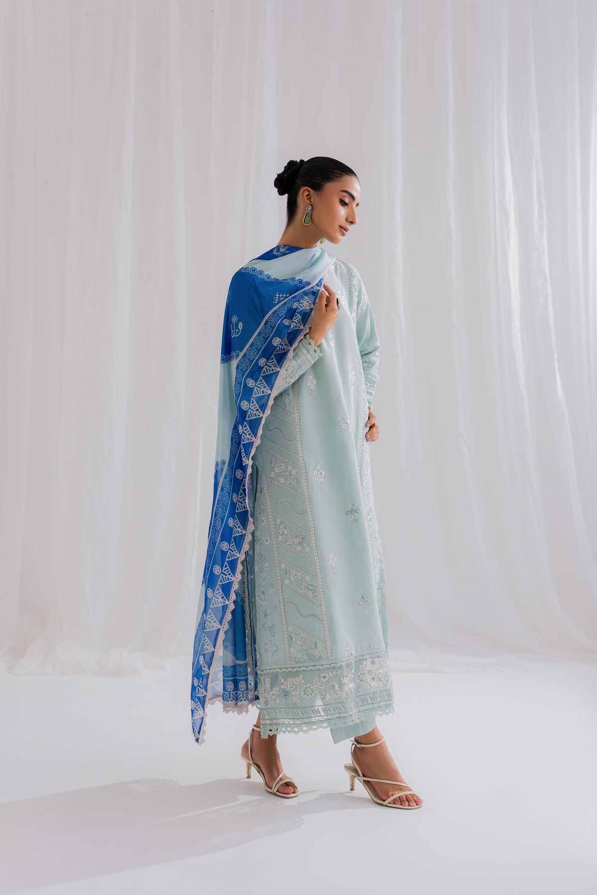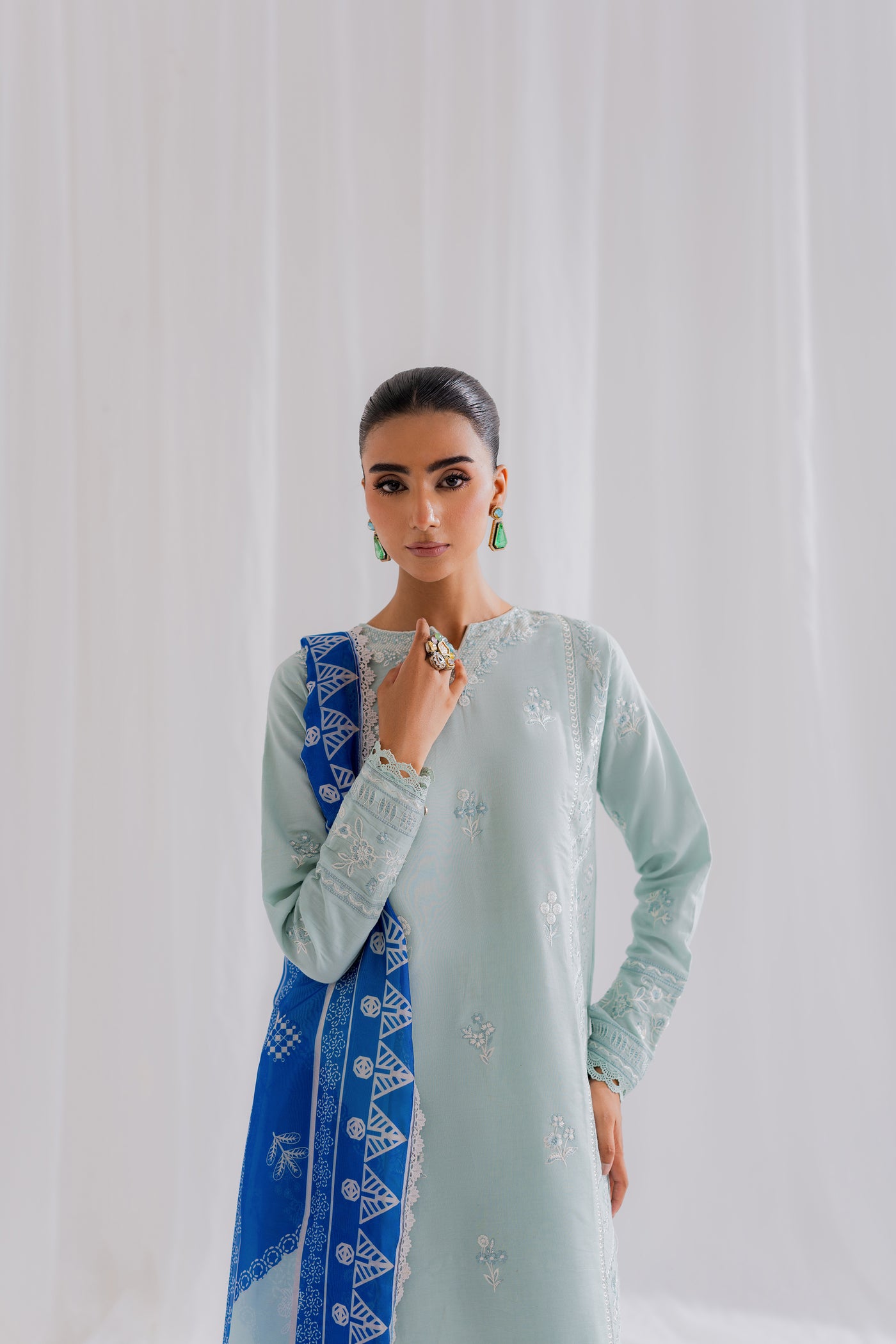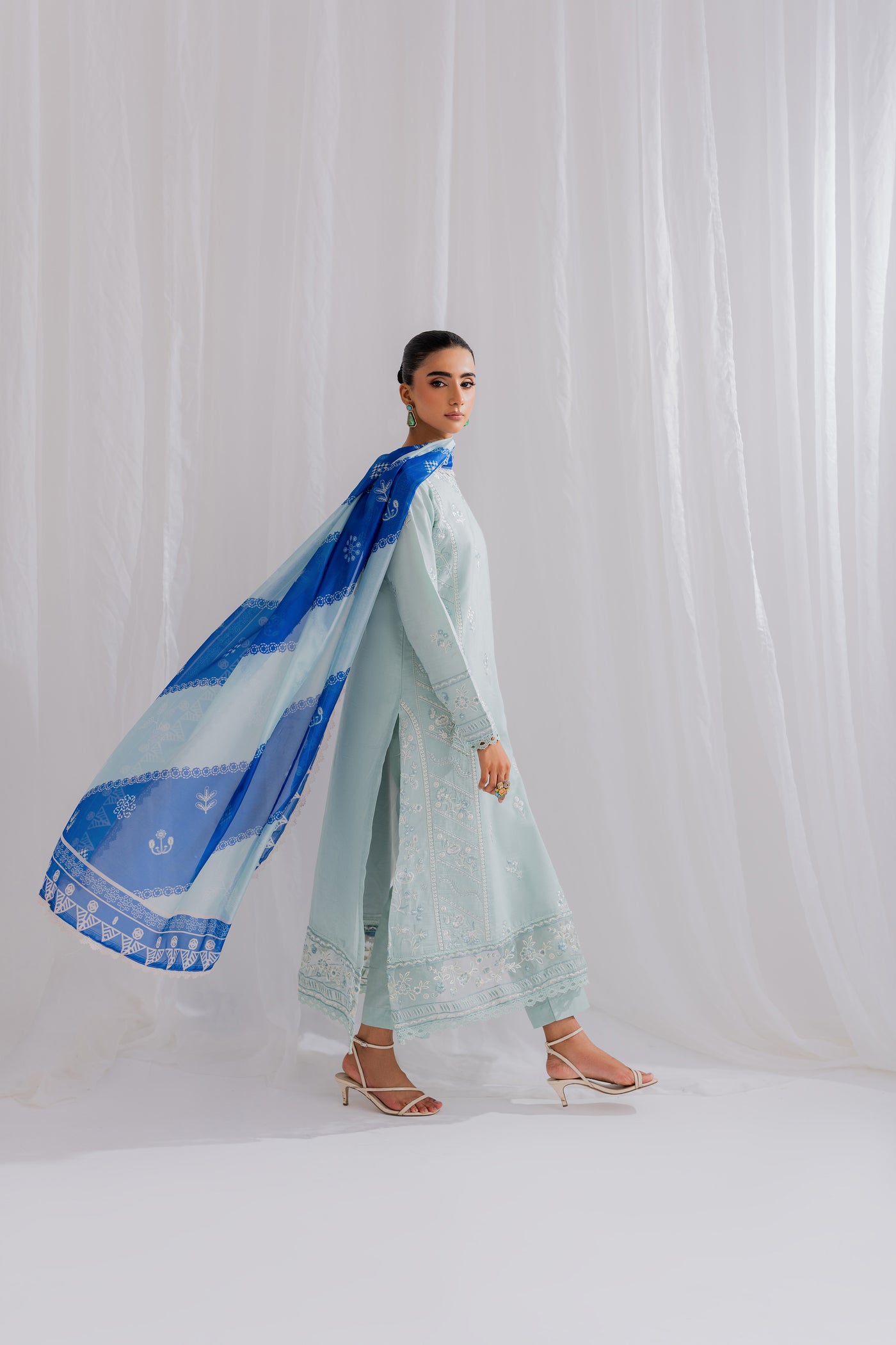 Refresh your summer wardrobe with this ice-blue cotton set, blending comfort and understated elegance. The long, graceful silhouette flatters effortlessly, while the boat neckline, fitted sleeves, and delicate embroidery add a touch of quiet luxury to your everyday style.