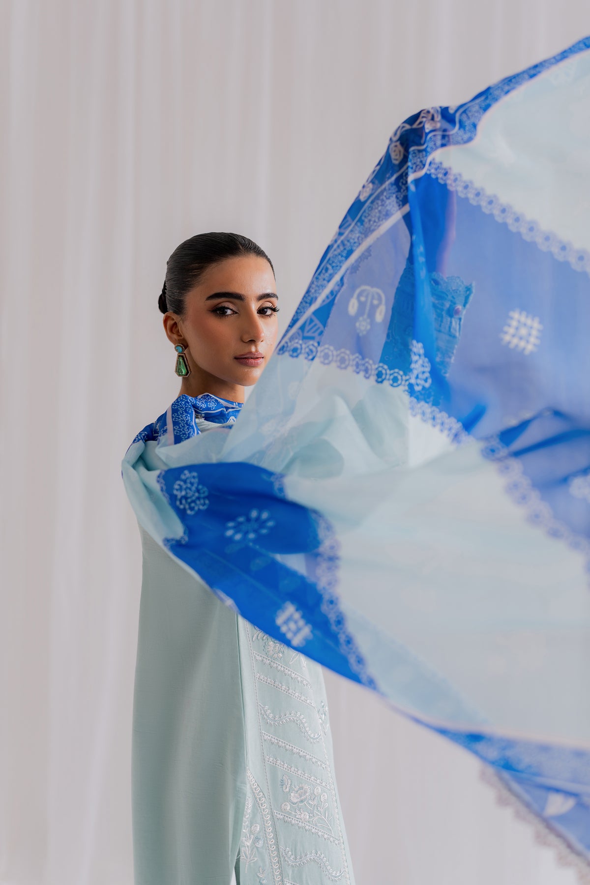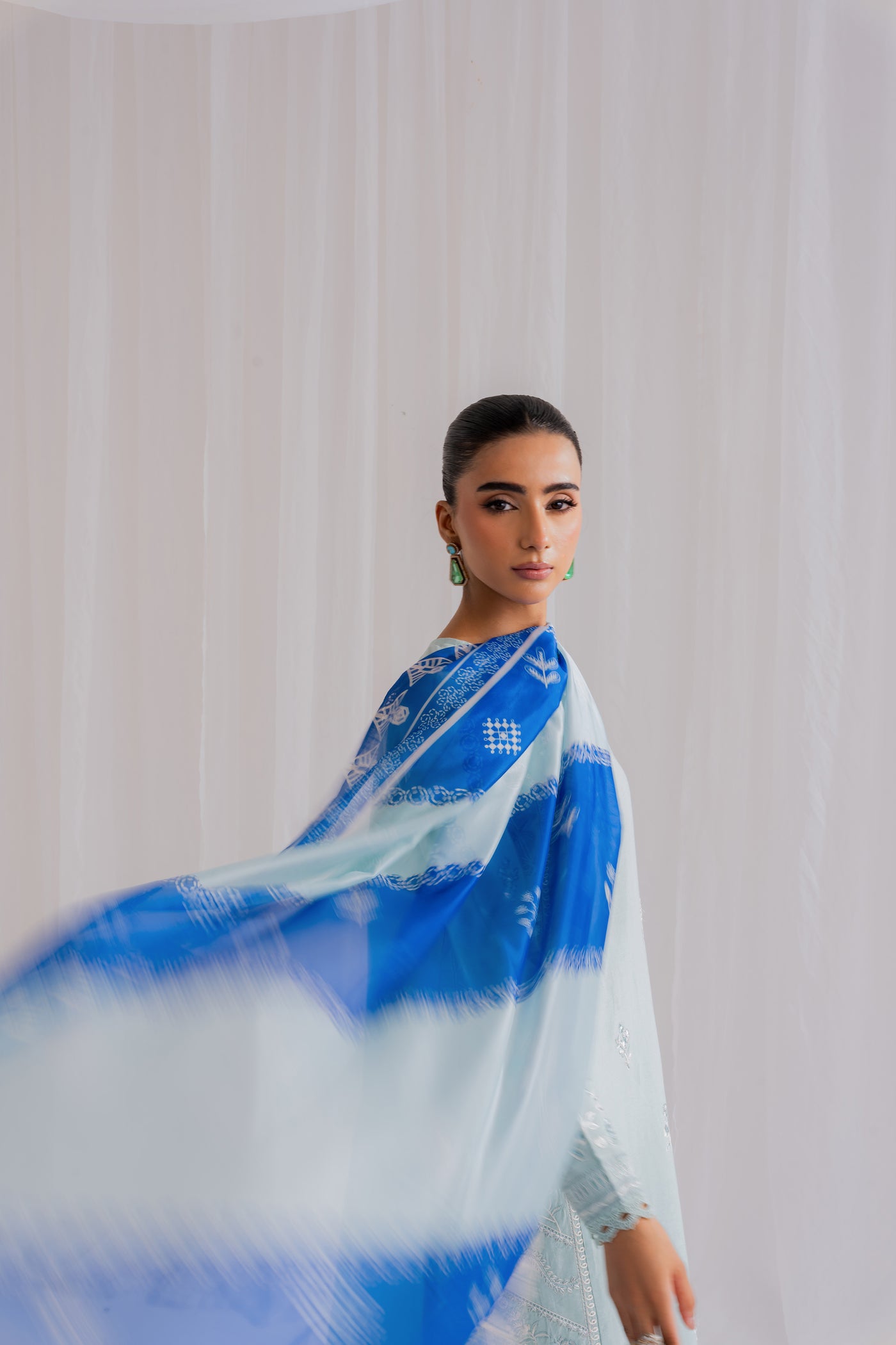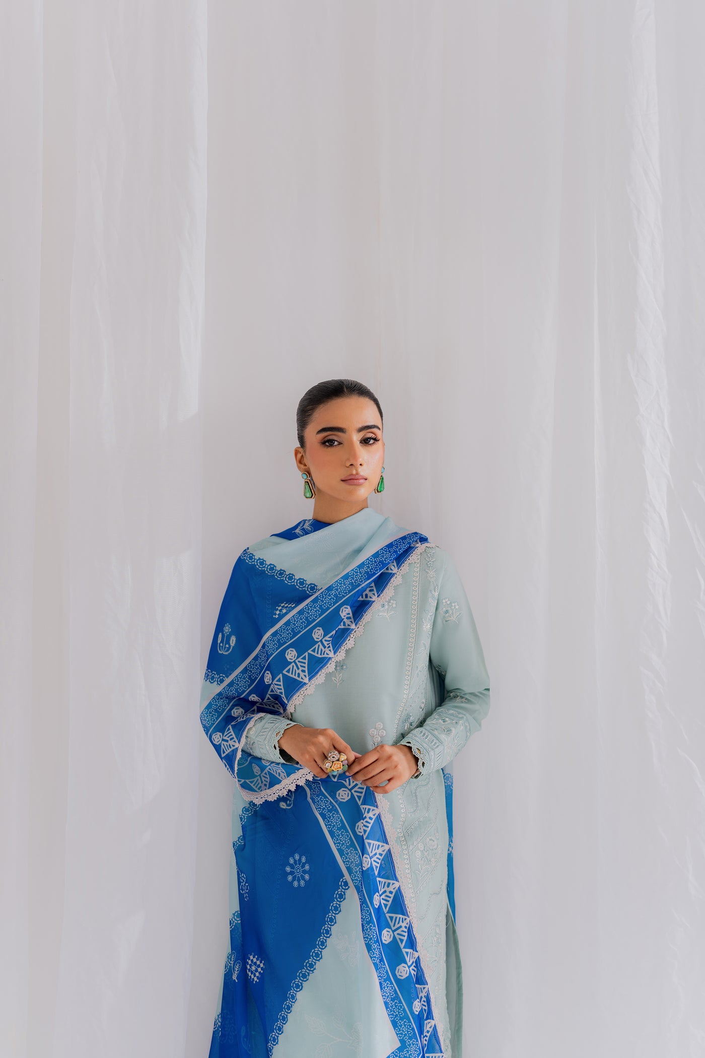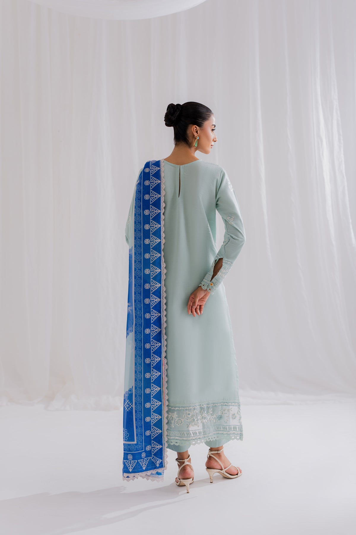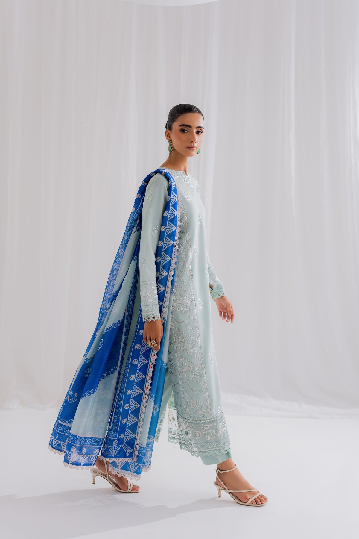 Refresh your summer wardrobe with this ice-blue cotton set, blending comfort and understated elegance. The long, graceful silhouette flatters effortlessly, while the boat neckline, fitted sleeves, and delicate embroidery add a touch of quiet luxury to your everyday style.