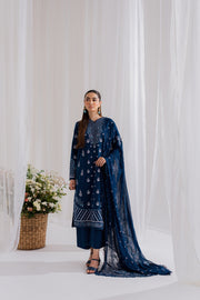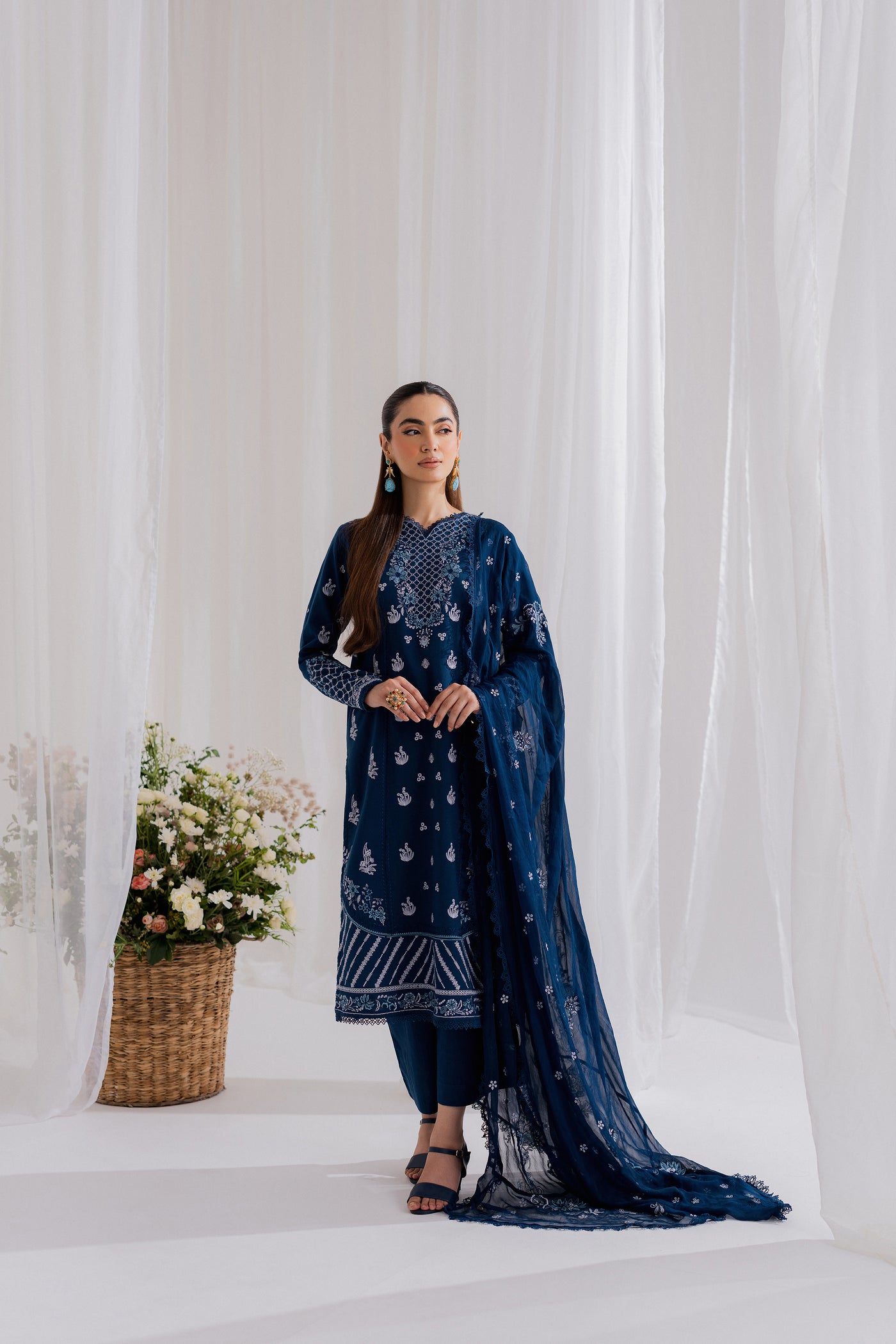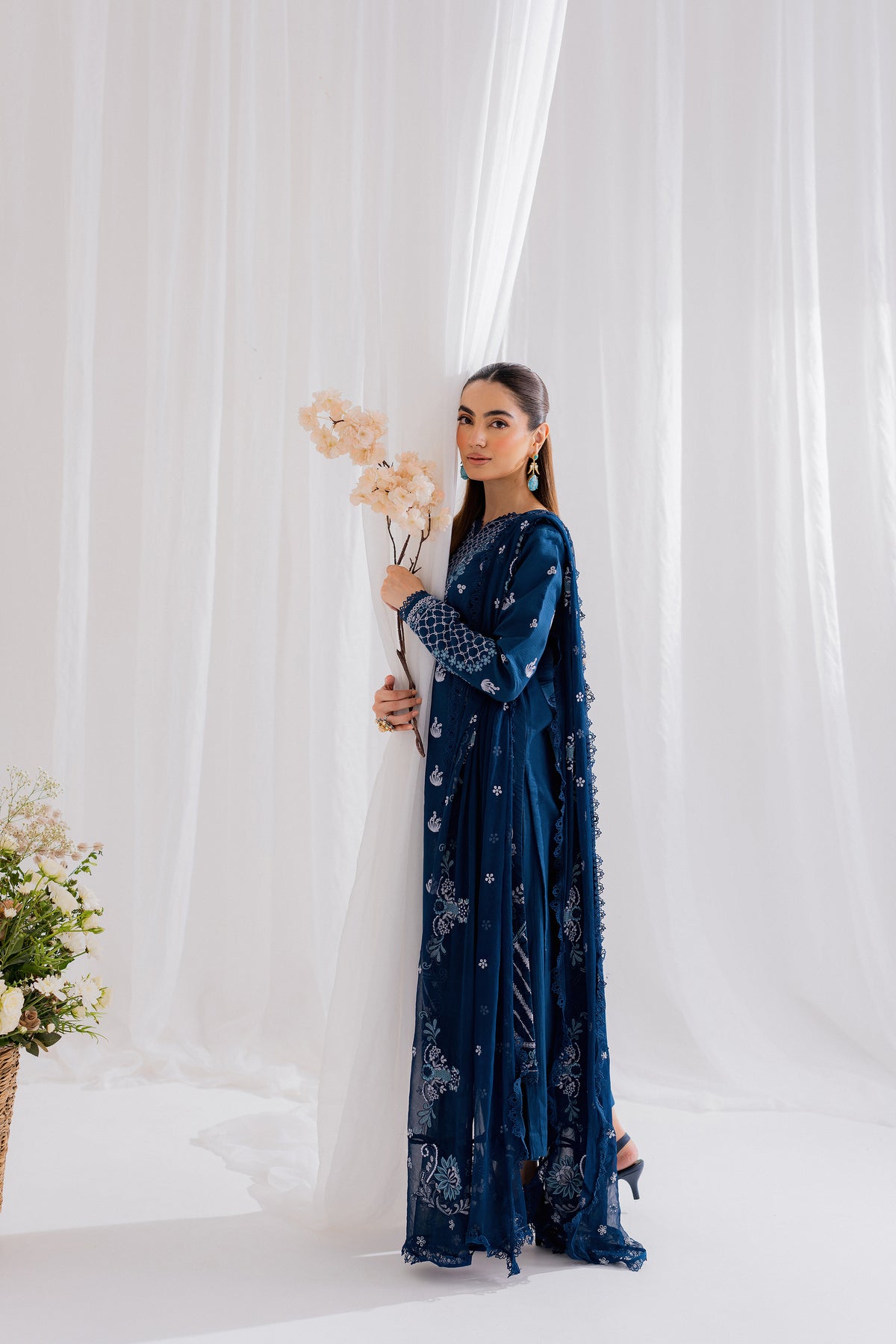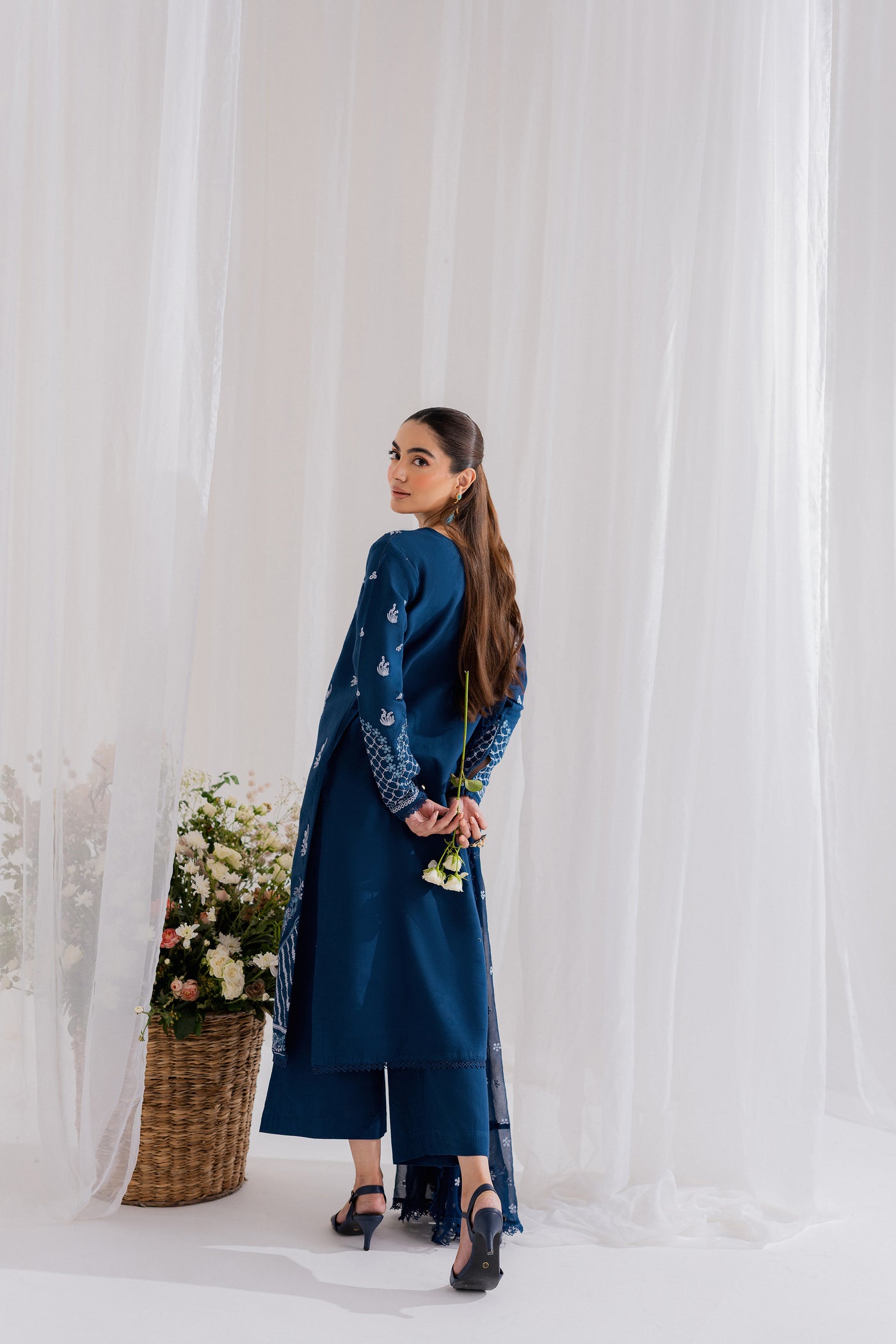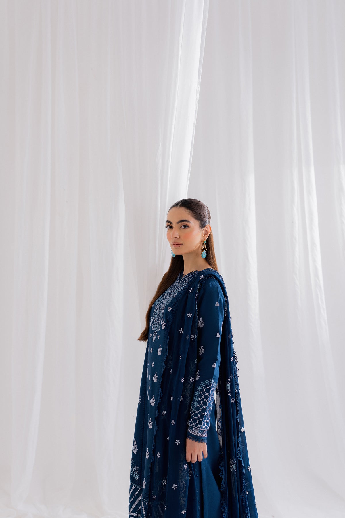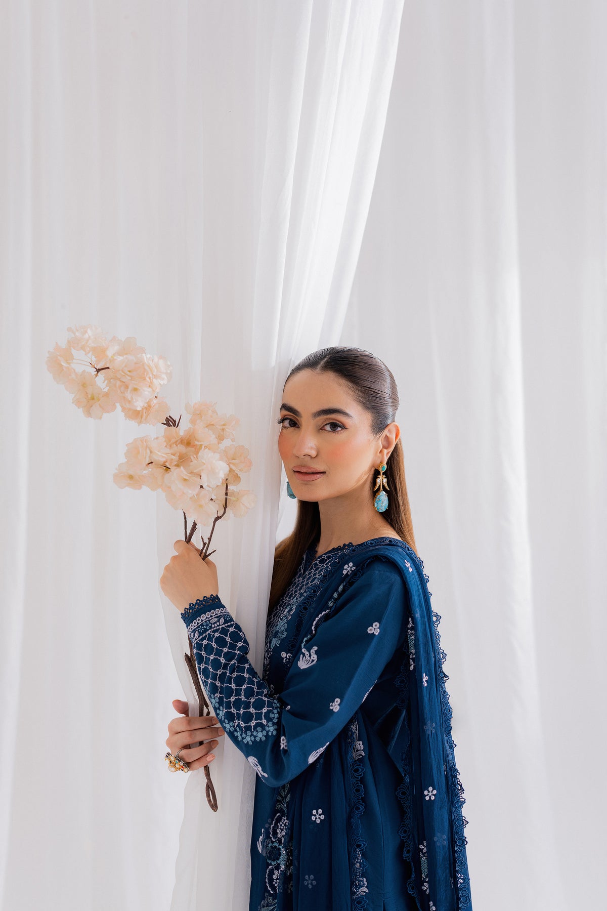 A navy blue cotton set featuring a panelled shirt with an embroidered neckline, fitted embroidered sleeves, and lace detailing on the hem and cuffs.