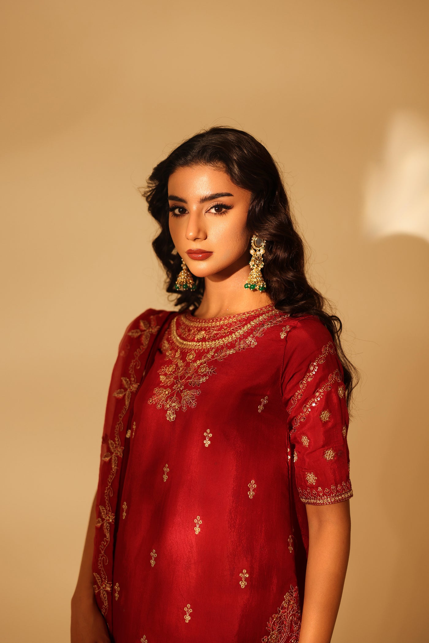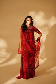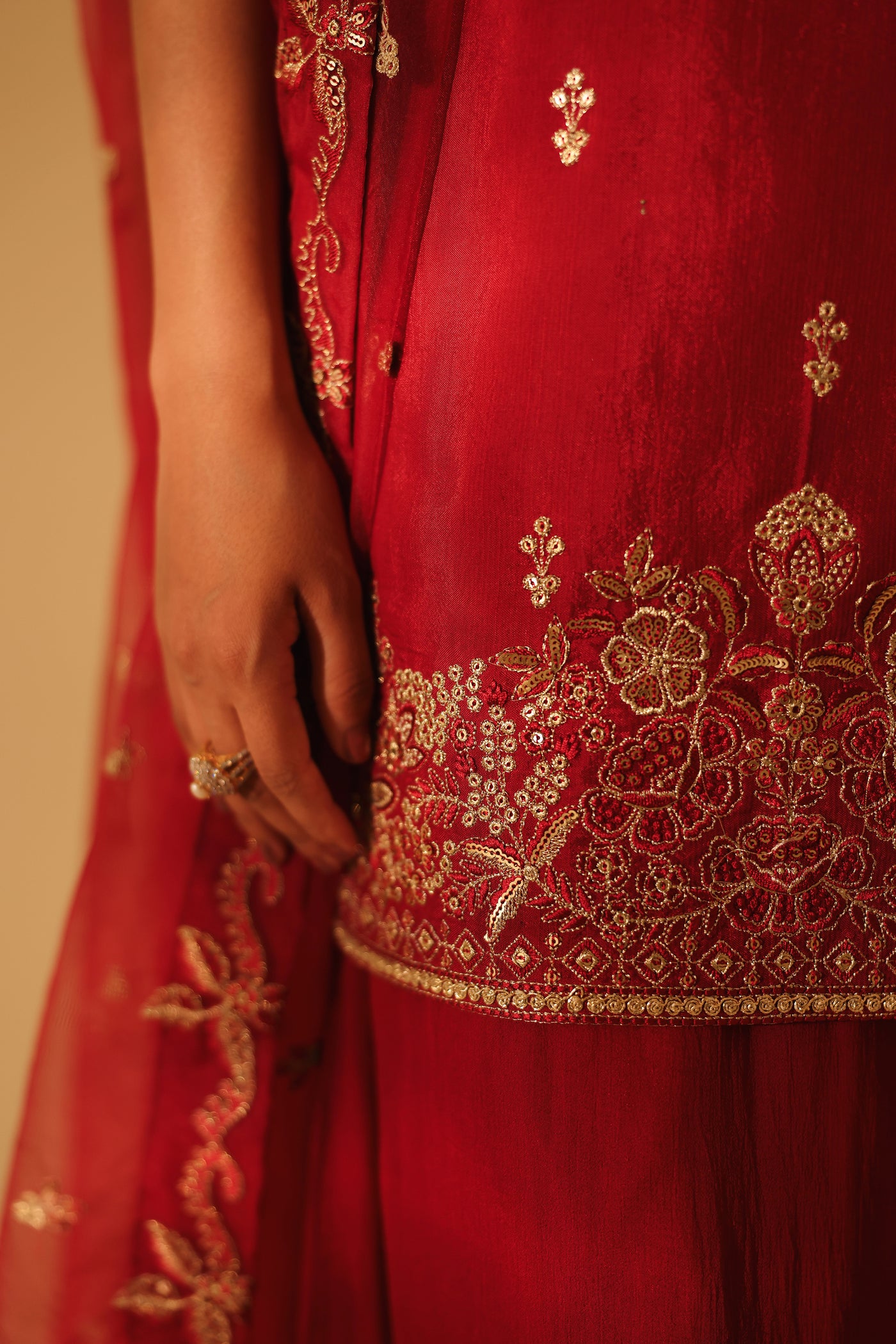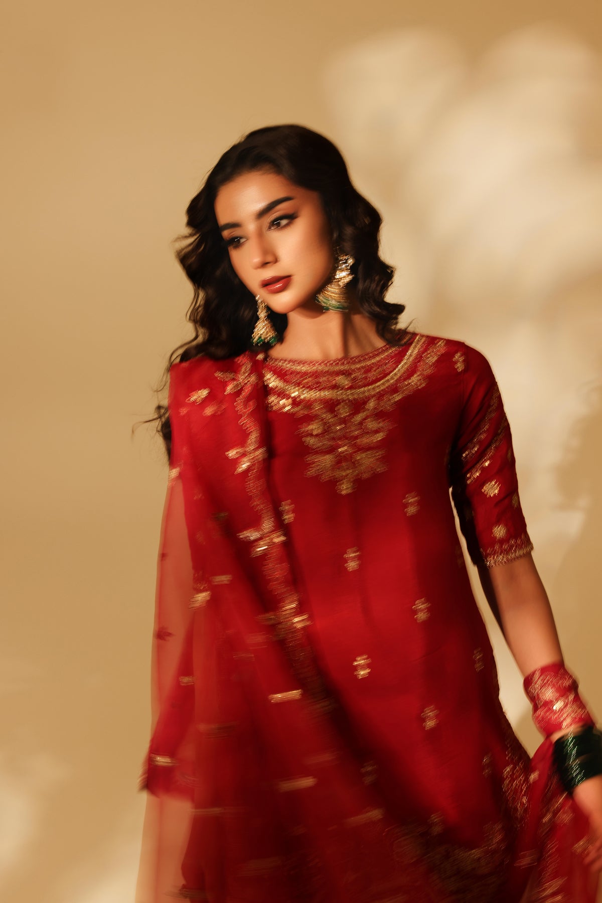 A celebration of refined elegance, this red raw silk short shirt captivates with its high boat neckline and intricate floral embroidery, elevated with exquisite tilla and sitara detailing. The look is completed with a delicately embroidered organza dupatta and a flowy chiffon sharara, blending timeless craftsmanship with understated luxury. Perfect for weddings, festive affairs, and traditional soirées.