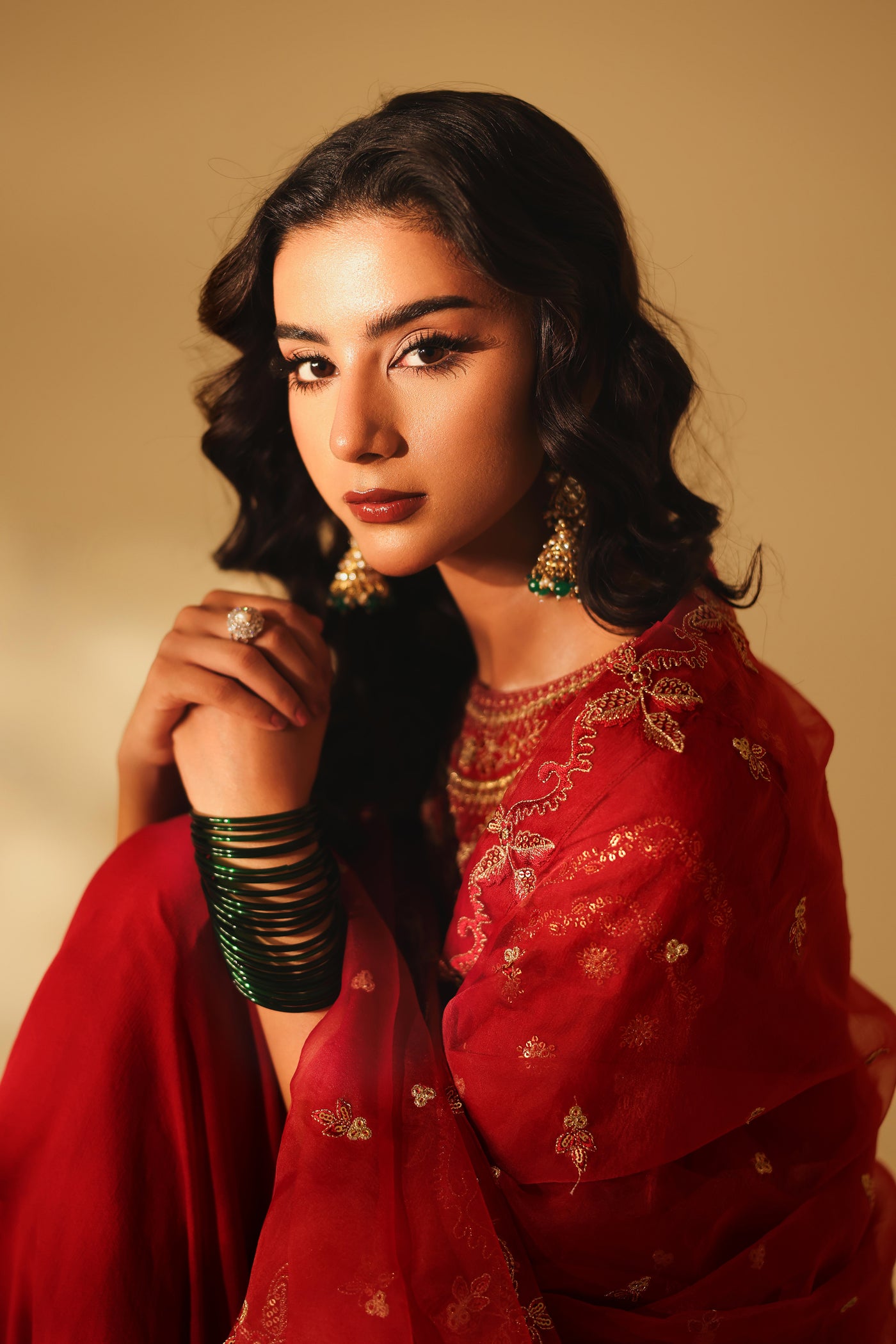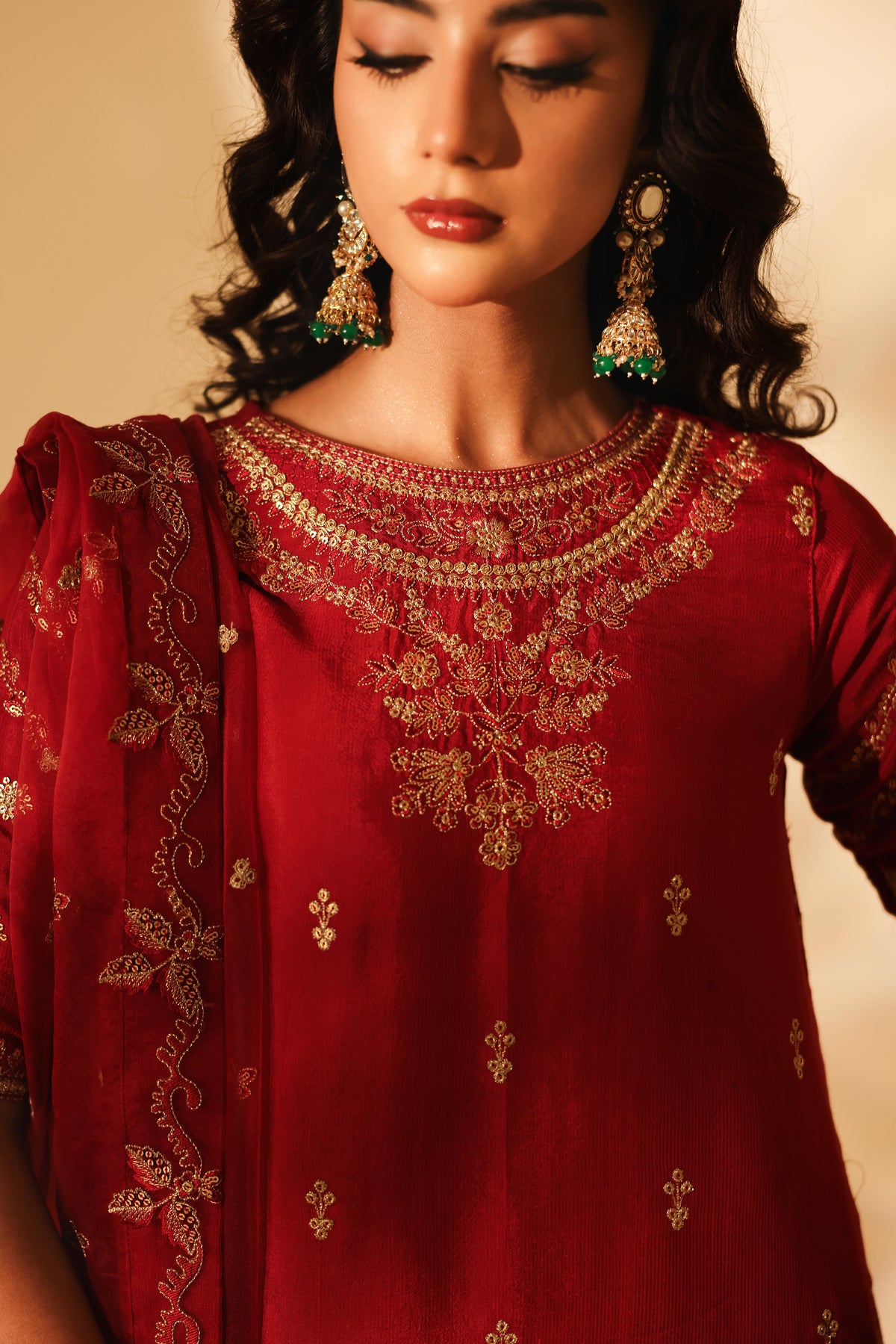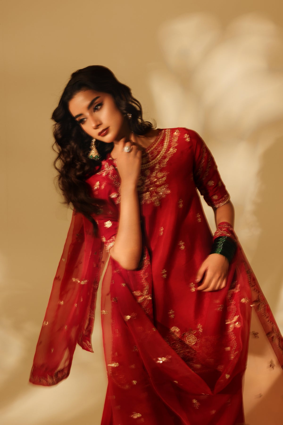 A celebration of refined elegance, this red raw silk short shirt captivates with its high boat neckline and intricate floral embroidery, elevated with exquisite tilla and sitara detailing. The look is completed with a delicately embroidered organza dupatta and a flowy chiffon sharara, blending timeless craftsmanship with understated luxury. Perfect for weddings, festive affairs, and traditional soirées.